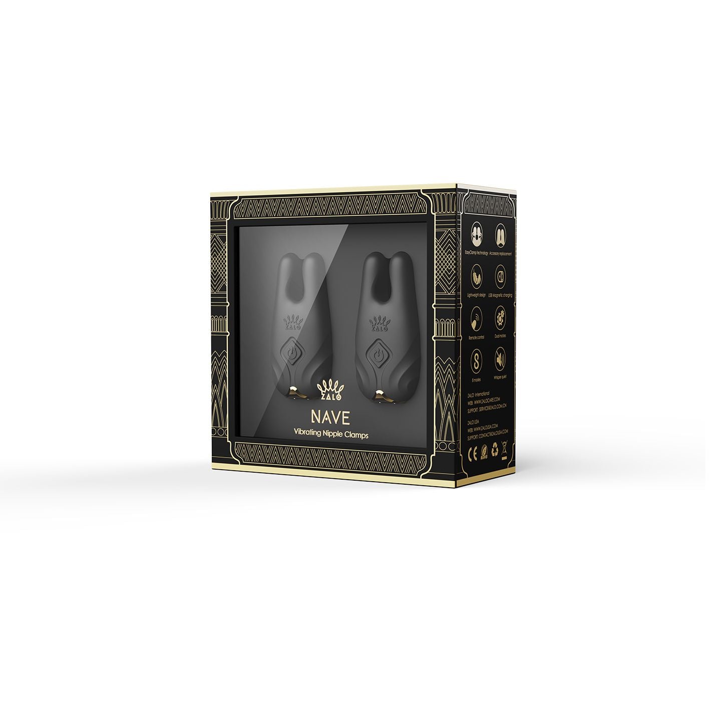 Elke NAVE tepelklem is verborgen door een laag luxueus zijdezachte vloeibare siliconen en toont ZALO's EasyClamp-technologie. Knijp voorzichtig in de onderkant van NAVE om de klem te openen en bevestig deze aan tepels en andere erogene delen van het lichaam. NAVE wordt ook geleverd met extra klemtips voor verschillende tepelmaten. Een van de opties voor de tipmaat is geschikt voor tepels met een diameter van 8-15 mm en kan ook worden gebruikt door mensen die zijn bevallen. De platte binnenkant van de klem past comfortabel rond de tepel. De andere maatoptie past op tepels met een diameter van 5-10 mm en heeft een binnenkant met wrijvingspunten die het stimulerende gevoel versterken.